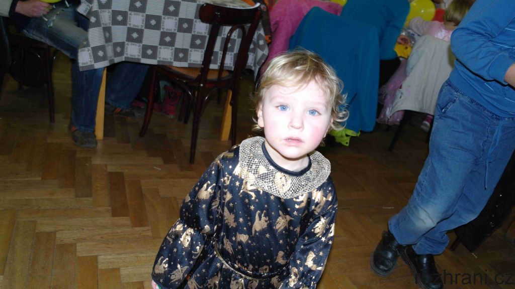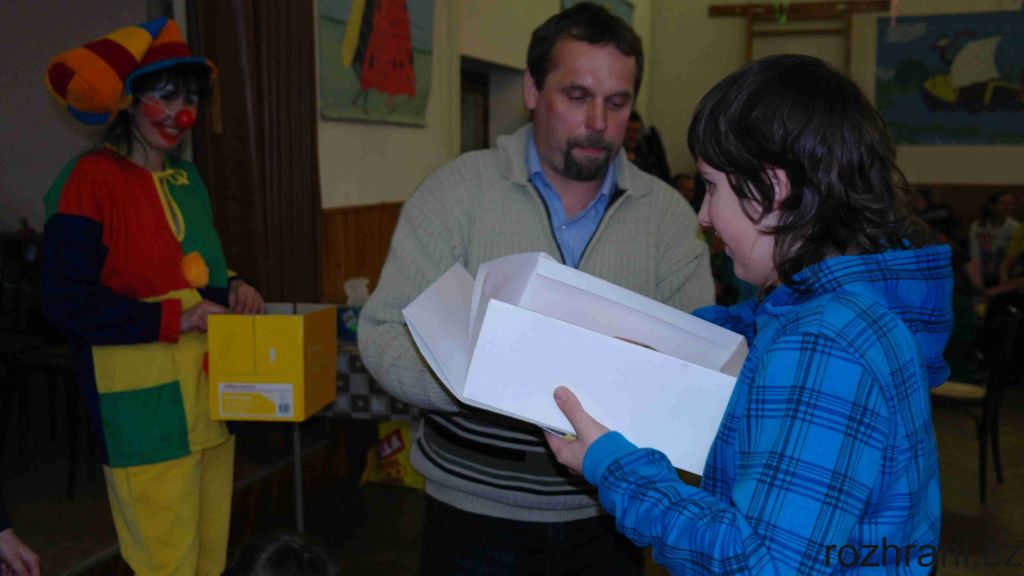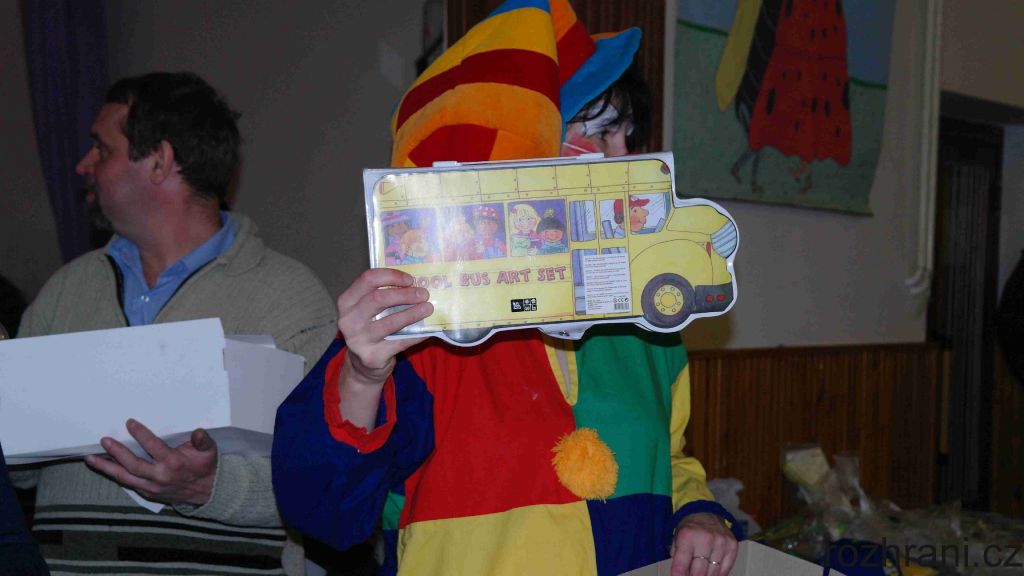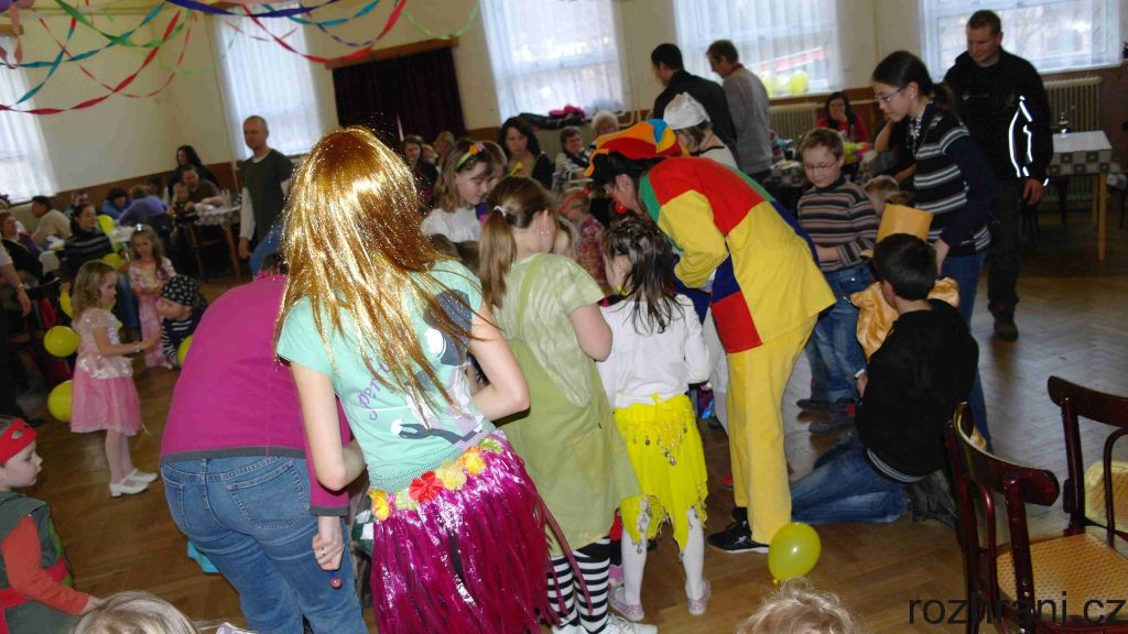 Všechny přítomné přivítal vodník (nebo snad vodnice) od Žbluňáku. Pro ty neznalé, to je malý rybníček zvící velikosti toho Rákosničkova ze známé pohádky. Napřed si postěžoval, že mu někdo loni vylovil všechny ryby, ale prý už tam jsou zase, tak se můžeme přijít podívat. V loňském roce provázel děti odpolednem žlutý klaun, vodník říkal, že nepřijde. Jenže to se trošku spletl. Než to stačil doříct, klaun se objevil ve dveřích a že mu bylo po dětech smutno. Tak nakonec provázeli děti sobotním odpolednem oba.